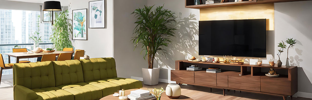 Tapetes, quadros, plantas e objetos decorativos ajudam a conectar os espaços e transmitir sensação de continuidade.